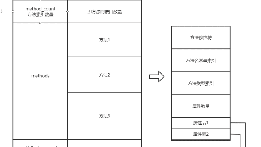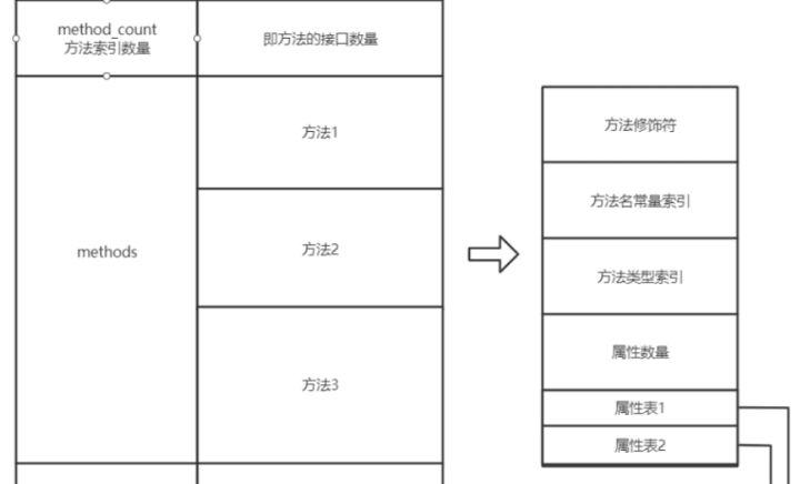 然后方法在class文件中时这样存放的, 先是一个method_count数量,接着再存储方法。