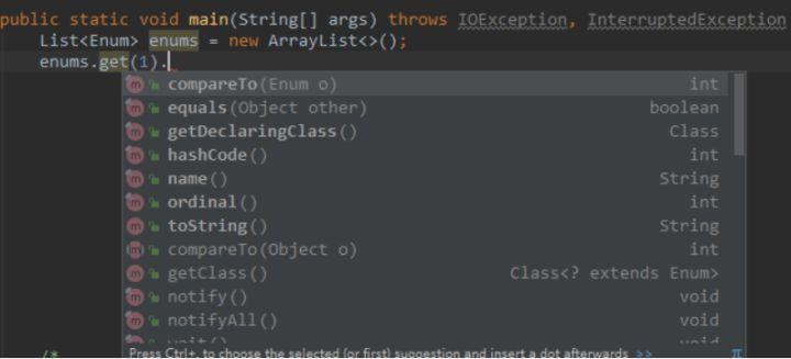 A: 没有实现, values方法是编译器加的。因此从List<Enum>里取出的对象,是不能调用values()的。