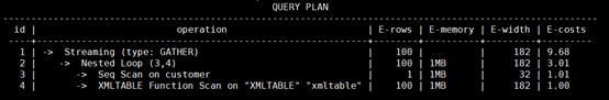 (3 rows)在GaussDB(DWS)上,XMLTABLE函数支持下推到数据节点DN执行的STREAM查询计划,XML数据在数据节点上进行解析生成XMLTABLE结果表,通过GATHER STREAM将结果汇总到协调节点CN上,能够下推到DN的STREAM计划具有较好的查询性能。