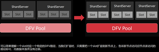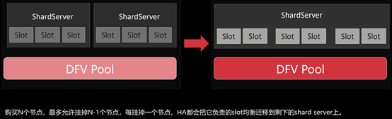 鉴于它有共享存储的能力,也即share everything,它能过把分片上的路由信息,迁移到剩下的分片,并通过share everything能力看到挂掉分片的那部分数据,现在只需要一把“钥匙”,即可处理这部分数据。而这把“钥匙”就是其中一个Slot的路由信息:Slot的路由信息把宕机分片的信息迁移到“活着”的分片Sever上,最后“活着”的Sever就拥有打开整个集群的“钥匙”。这,就是超可用的设计。