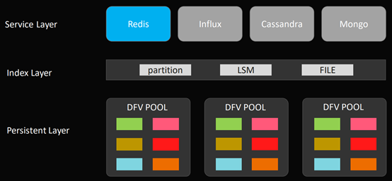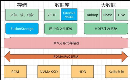 通过下图可以看到,在上层的数据服务和下层的存储之间,是通过RDMA的高性能网络来连接,从而能够起到一个降低时延的作用。作为最底下的存储层,被分成了不同的存储介质,如SCM、NVMe SSD、HDD、众核/多核等等。不同的存储介质是用来满足不同的服务对于性能的不同的需求的。