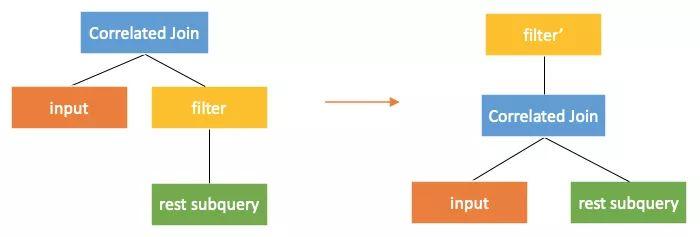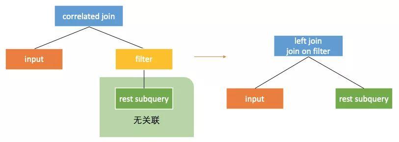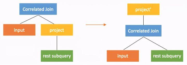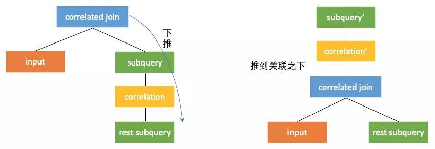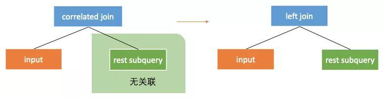 表现在计划上,就是将correleted join算子向右下推到产生关联的部位的下面。当correlated join算子的左右子树没有关联列的时候,correlated join算子就可以转换成join算子。这样子查询就通过和外部查询join的方式获得了关联列的值,从而可以自上而下计算,回到原本的计算方式。如下图,下图中rest subquery为在关联产生部位之前的子查询部分。当correlated join 推到产生关联的部位之下,就可以转换为普通的join了。