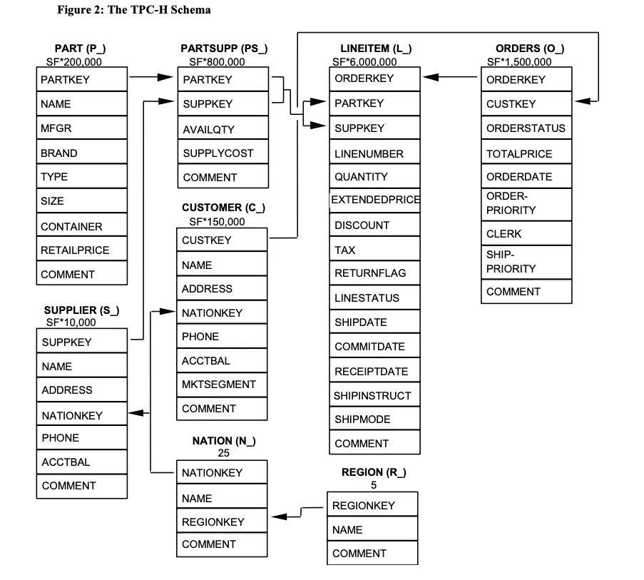 因为这种可以使用关联列的灵活性,将sql查询写成子查询的形式往往可以极大的简化sql以及使得sql查询的语义更加方便理解。下面我们通过使用tpch schema来举几个例子以说明这一点。tpch schema是一个典型的订单系统的database,包含customer表,orders表,lineitem表等,如下图: