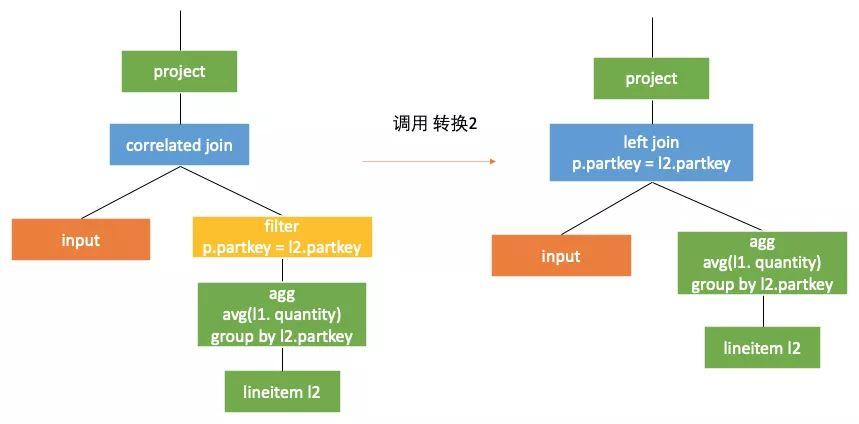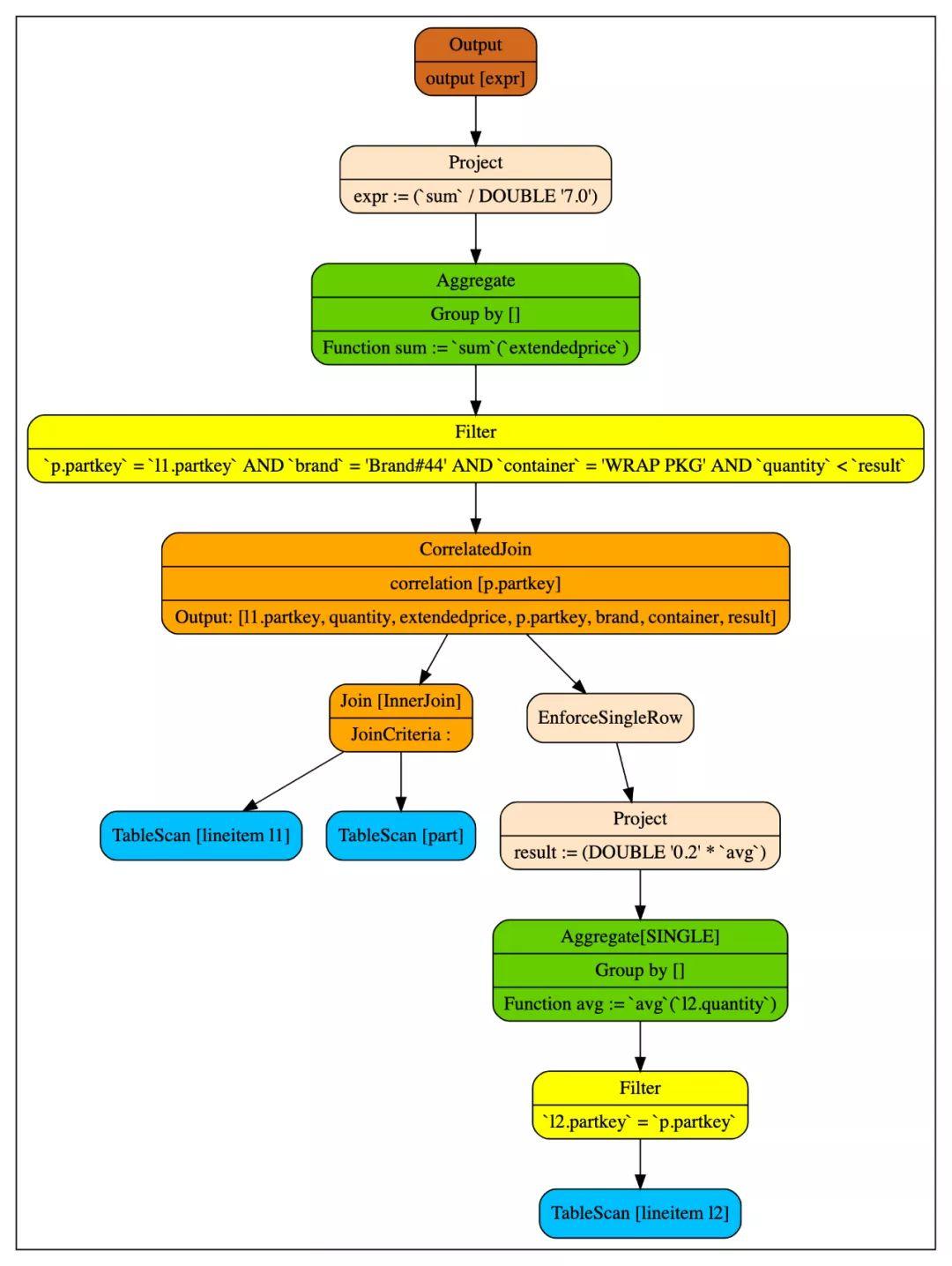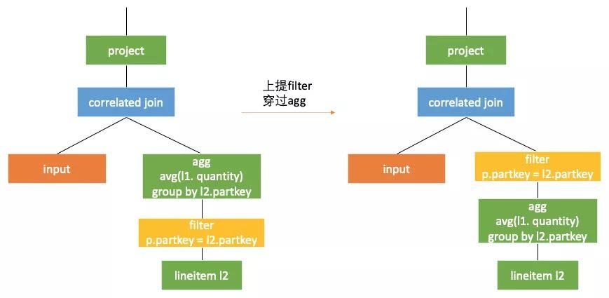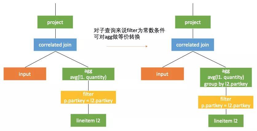 这里我们忽略 avg(Ø)!=avg(null) 。如果考虑这个情况,则需要mark子查询全部的行,在correlated join之后根据子查询的结果结合mark的值对空集进行特别处理(将mark了的行的值从null变为0)。感兴趣的读者可以参考下一张中q17的最终计划。
