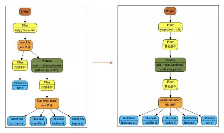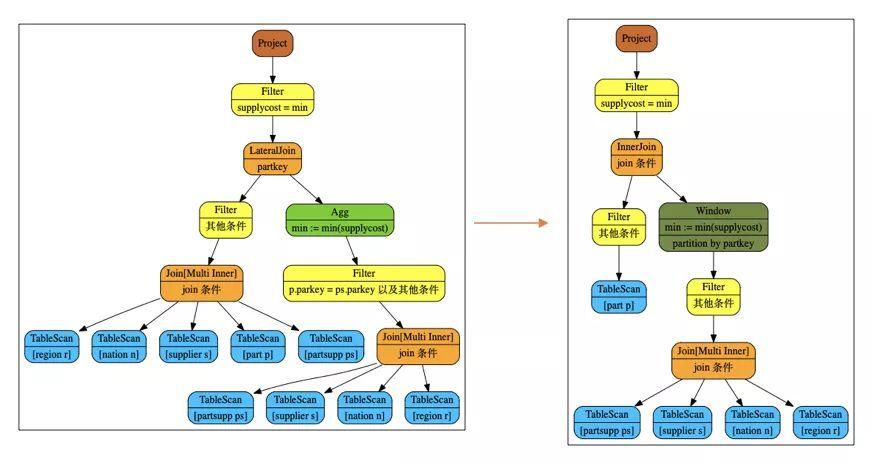 window解关联的改写就是在外部查询包含子查询中全部的表和条件时,可以直接使用window将子查询的结果拼接到外部查询上。他好处是节约了很多tablescan。比如说tpch q2。可以进行下面的改写: