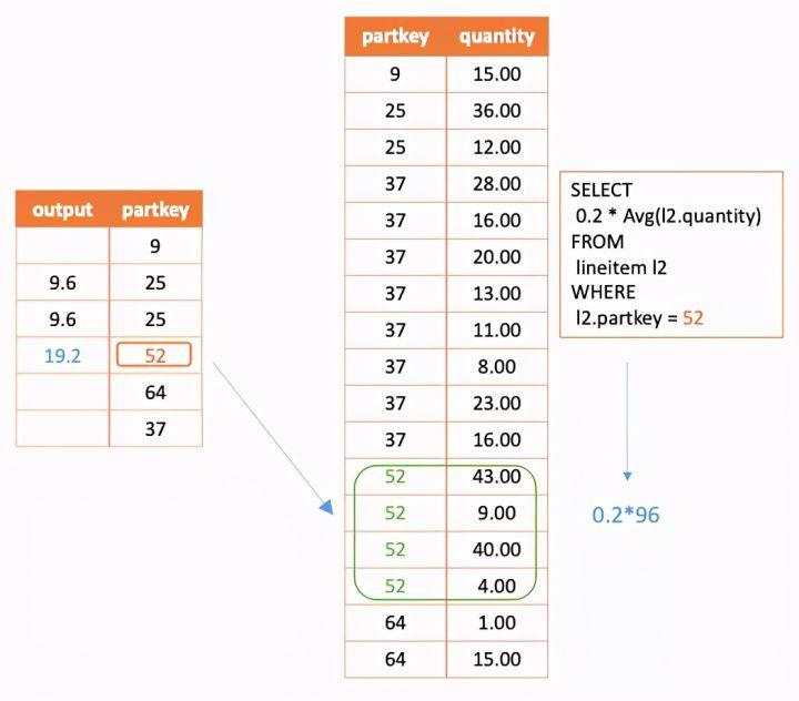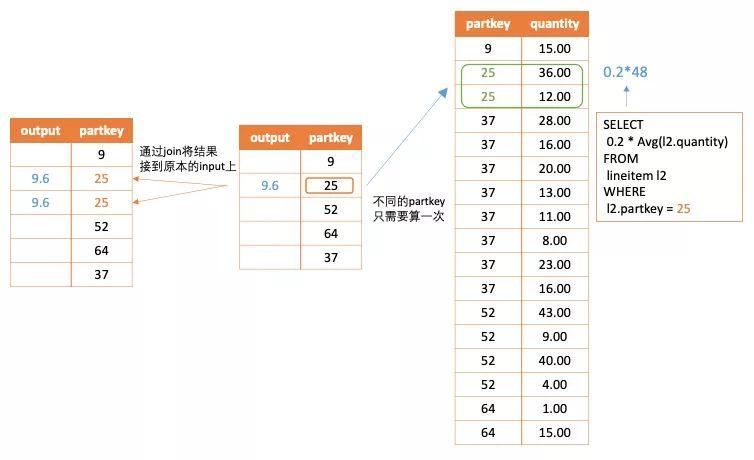 带入到之前的例子中如下图所示,对外部查询的关联列partkey先进行distinct,然后带入子查询计算结果,最后再通过join将对应的结果接到原本的外部查询上。