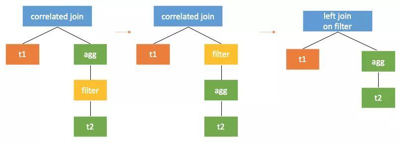 );这里由于t2.c1 = t2.c1可以推到agg 上面(因为对于子查询这是一个在group by列上的条件),我们就可以进行下面的转换。先把关联的filter上提(有时需要改写),这样就只要把correlatedjoin推过filter,调用转换2就可以了。
