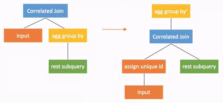 改写为在aggregation的group by的列中增加外部查询的全部列。这里要求外部查询一定有key,如果没有则需要生成临时的key。生成可以的算子在图中为assignuniqueid算子。