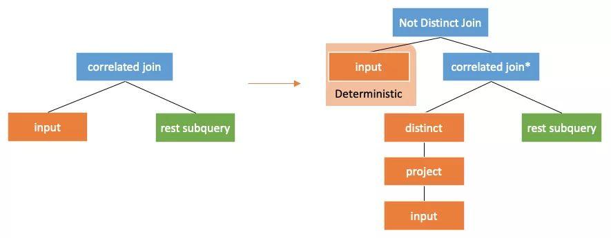 如果按照Unnesting Arbitrary Queries[3]的方法进行解关联,需要将input的一部分结果进行复用,这个复用需要执行引擎的支持。需要注意的是,当系统不支持复用的时候,我们需要执行两次input的子树(如下图),这个时候就需要input这颗子树的结果是deterministic的,否则无法用这个方法进行解关联。