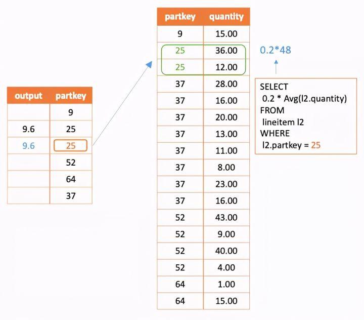 回顾上一节所说,子查询的查询结果是带入每一行关联列的值之后计算得出的,那么显而易见相同值的关联列带入子查询中计算出的结果是完全相同的。在上面的栗子中,对同样的p.partkey,correlatedjoin输出的子查询的结果是相等的。如下图中外部查询partkey为25的话产生的关联子查询时是完全相同的,那么结果也自然相同。