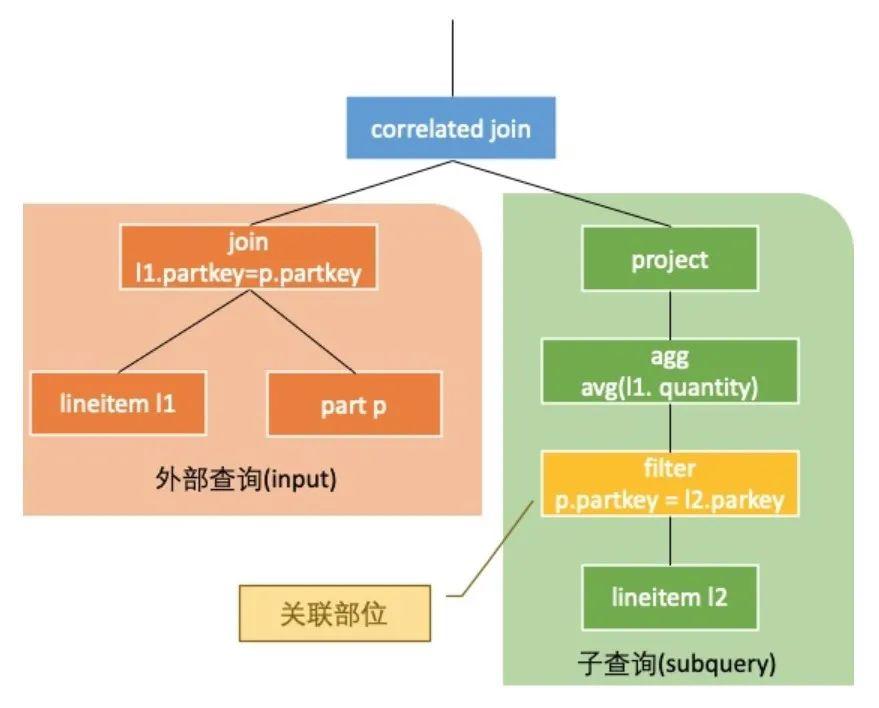 13 - TableScan[tpch:lineitem l2]我们将这个连接外部查询和子查询的算子叫做CorrelatedJoin(也被称之为lateral join, dependent join等等。它的左子树我们称之为外部查询(input),右子树称之为子查询(subquery)。子查询中出现的外部的列叫做关联列。在栗子中关联列为p.partkey。