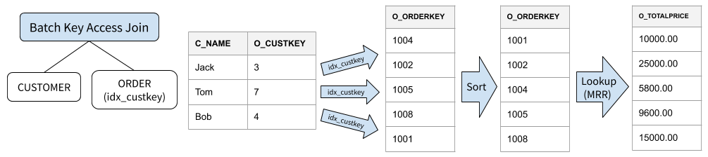BKA Join 可以看作一个性能优化版的 Index Nested-Loop Join。之所以称为 Batched,是因为它的实现使用了存储引擎提供的 MRR(Multi-Range Read) 接口批量进行索引查询,并通过 PK 排序的方法,将随机索引回表转化为顺序回表,一定程度上加速了查索引的磁盘 IO。