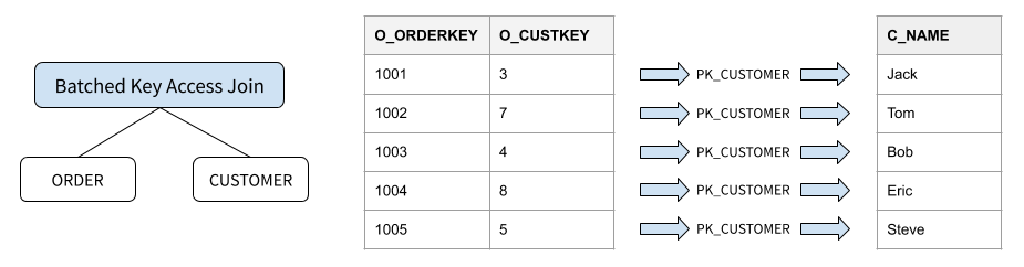 /* Query 1 */ SELECT o_orderkey, o_custkey, c_name FROM orders JOIN customer ON o_custkey = c_custkey WHERE o_orderkey BETWEEN 1001 AND 1005