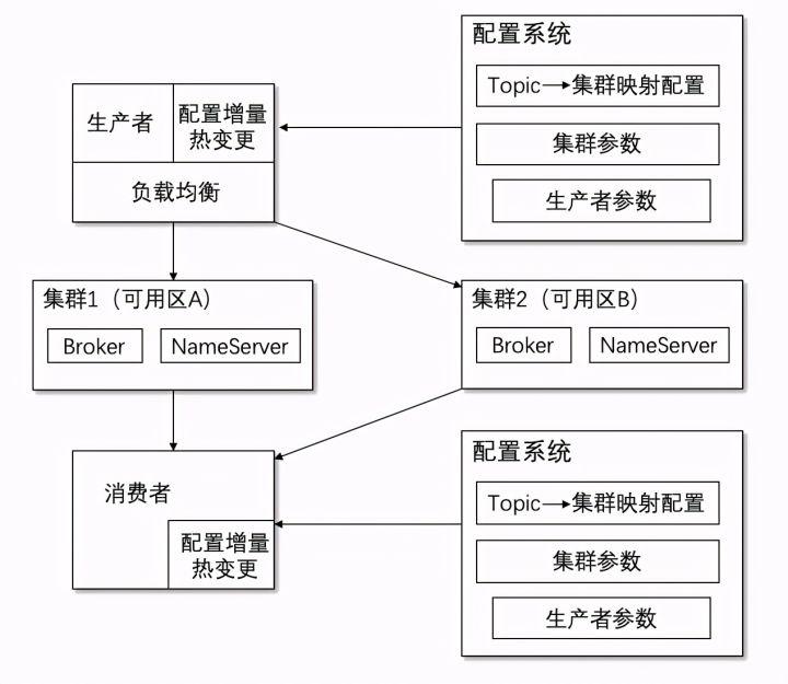所有的Topic默认都分配到两个可用区,生产者和消费者会同时连接至少两个独立集群(分布在不同的可用区),如下图:
