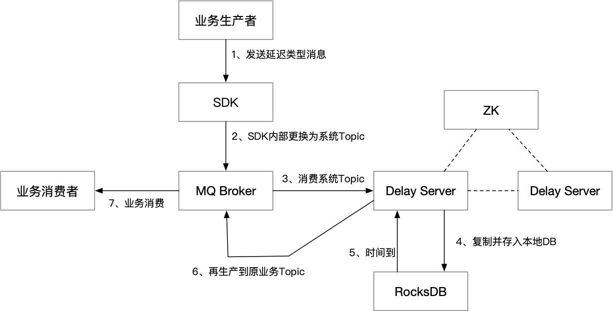 延迟消息是非常重要的业务功能,不过RocketMQ内置的延迟消息只能支持几个固定的延迟级别,所以我们又开发了单独的Delay Server来调度延迟消息: