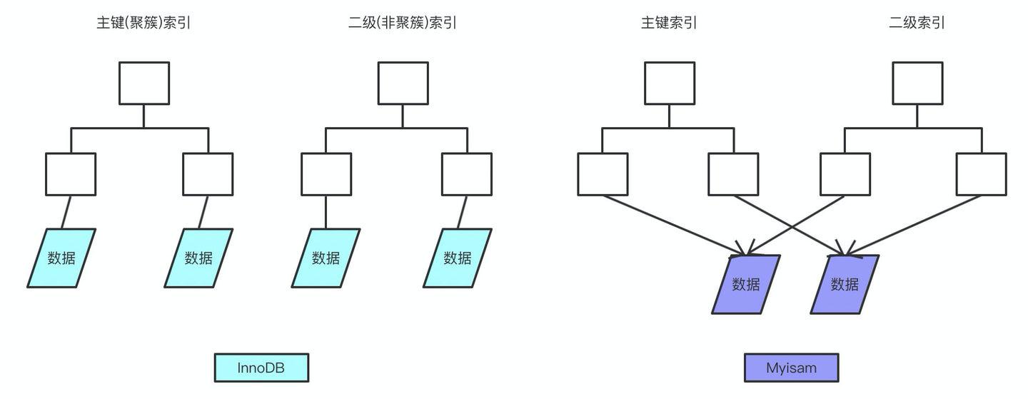 最终,我们一张图看看InnoDB和Myisam聚簇和非聚簇索引的区别