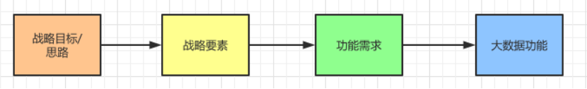 通常的情况是这样的,根据公司战略目标以及公司目前的能力和外部的威胁和机会,公司会定义一个战略思路。这个是公司发展的纲领,围绕这个战略纲领业务部门和运营部门对其进行分析和拆分,生成业务需求,然后从这个业务需要推到出需要哪些关键要素(节点)。再来看这些关键要素需要哪些数据为其进行决策和支撑。最后,将这些要素变成业务需求提交给产品团队进行分析,然后交由大数据技术团队完成对应的功能。
