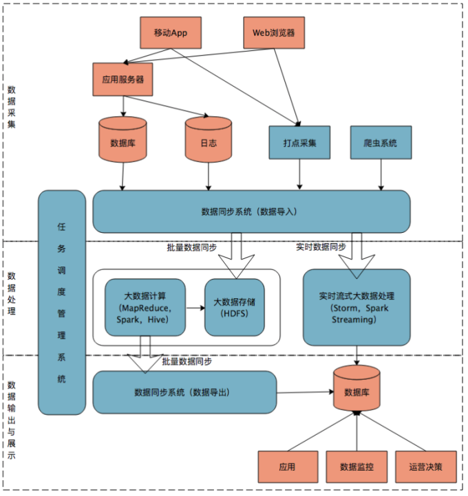 里包括从多个源头收集数据信息,例如:浏览器、移动设备、服务器日志文件。再将这些信息数据和日志等同步到大数据系统中,注意同步的过程需要考虑数据源和数据结构的差异。同步会使用