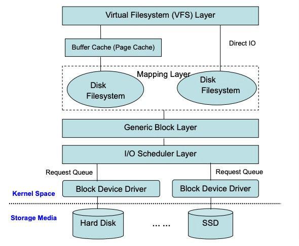 这张图大体上描述了 Linux 系统上,应用程序对磁盘上的文件进行读写时,从上到下经历了哪些事情。