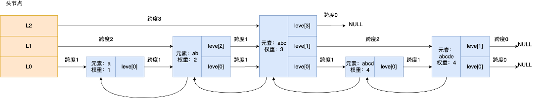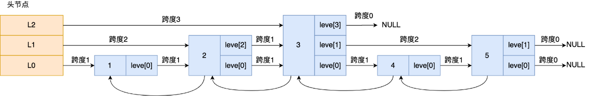 图中头节点有 L0~L2 三个头指针,分别指向了不同层级的节点,然后每个层级的节点都通过指针连接起来: