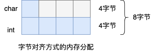 这是因为默认情况下,编译器是使用「字节对齐」的方式分配内存,虽然 char 类型只占一个字节,但是由于成员变量里有 int 类型,它占用了 4 个字节,所以在成员变量为 char 类型分配内存时,会分配 4 个字节,其中这多余的 3 个字节是为了字节对齐而分配的,相当于有 3 个字节被浪费掉了。