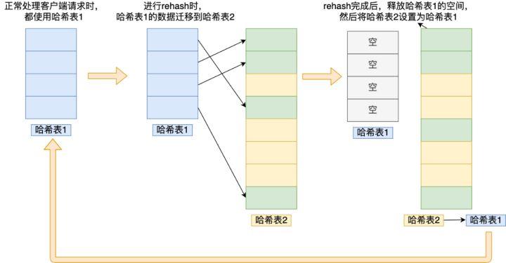 这样就巧妙地把一次性大量数据迁移工作的开销,分摊到了多次处理请求的过程中,避免了一次性 rehash 的耗时操作。