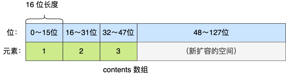 现在,往这个整数集合中加入一个新元素 65535,这个新元素需要用 int32_t 类型来保存,所以整数集合要进行升级操作,首先需要为 contents 数组扩容,在原本空间的大小之上再扩容多 80 位(4x32-3x16=80),这样就能保存下 4 个类型为 int32_t 的元素。