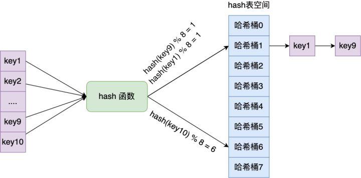 举个例子,有一个可以存放 8 个哈希桶的哈希表。key1 经过哈希函数计算后,再将「哈希值 % 8 」进行取模计算,结果值为 1,那么就对应哈希桶 1,类似的,key9 和 key10 分别对应哈希桶 1 和桶 6。