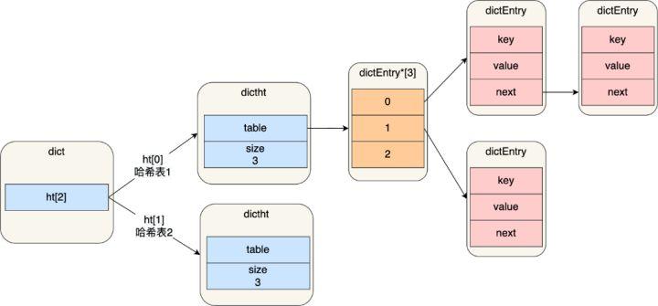 } dict;之所以定义了 2 个哈希表,是因为进行 rehash 的时候,需要用上 2 个哈希表了。