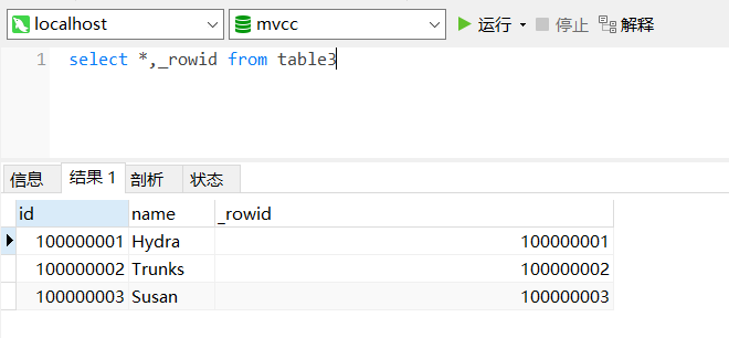 INSERT INTO table10 VALUES (100000003, 'Susan');查看表中的数据,此时对应的_rowid理论上是1~3: