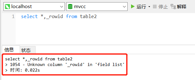 ) ENGINE=InnoDB;在table2执行上面相同的查询,结果报错无法查询_rowid,也就证明了如果主键字段是非数值类型,那么将无法直接查询_rowid。
