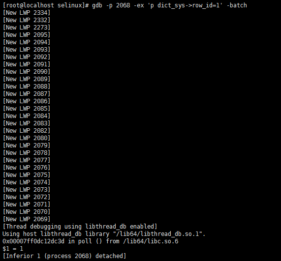 gdb -p 2068 -ex 'p dict_sys->row_id=1' -batch命令执行结果: