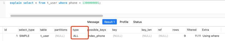 select * from t_user where phone = 1300000001;