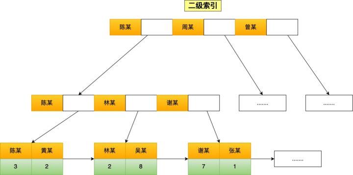 如果将 name 字段设置为普通索引,那么这个二级索引长下图这样,叶子节点仅存放主键值。