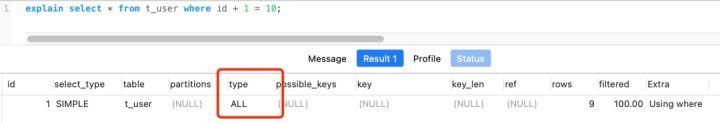 explain select * from t_user where id + 1 = 10;