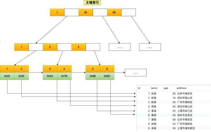 如果使用的是 InnoDB 存储引擎, B+ 树索引的叶子节点保存数据本身,如下图所示: