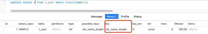 alter table t_user add key idx_name_length ((length(name)));然后我再用下面这条查询语句,这时候就会走索引了。