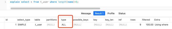 比如下面这条语句查询条件中对 name 字段使用了 LENGTH 函数,执行计划中的 type=ALL,代表了全表扫描: