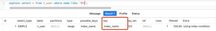 如果是查询 name 前缀为林的用户,那么就会走索引扫描,执行计划中的 type=range 表示走索引扫描,key=index_name 看到实际走了 index_name 索引: