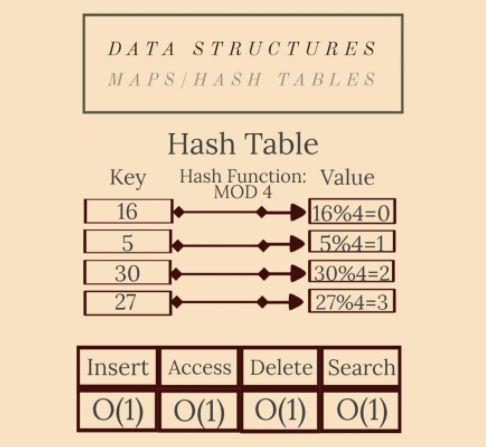 哈希表是一种特殊类型的映射。它使用散列函数生成一个散列码,放入一个桶或槽数组:键被散列,结果散列指示值的存储位置。