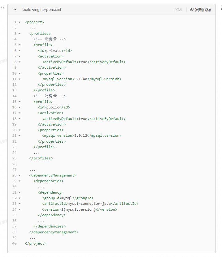 举个简单的例子,当我们的服务在公有云部署时,我们使用了一个云上版本为8.0的MySQL,而当我们要进行专有云部署时,用户提供一个自运维的版本为5.7的MySQL。因此,我们在不同的环境中使用不同的 mysql:mysql-connector-java 版本。