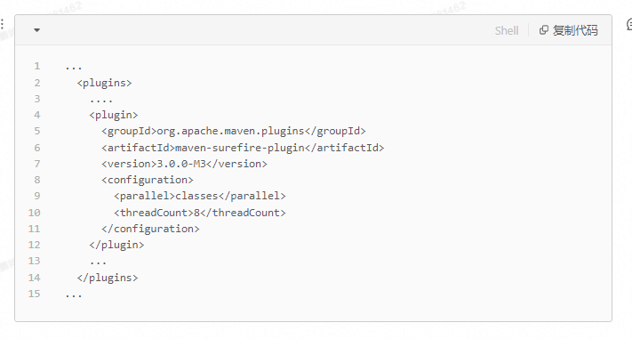 当你在执行mvn test的时候,默认情况下就是surefire插件在工作。如果我们想在测试中使用并行的能力,可以作如下配置。