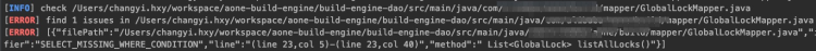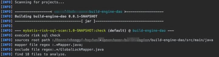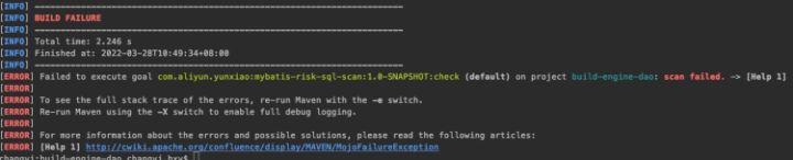 除了通过必要的code review准入,来避免类似的问题,更简单的,我们可以自己动手实现一个代码中sql扫描的插件,让代码在CI时直接失败掉,自动化的避免此类问题的发生。于是我们开发了一个maven插件,使用方法和效果如下: