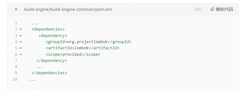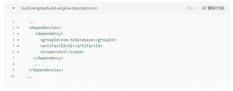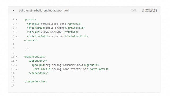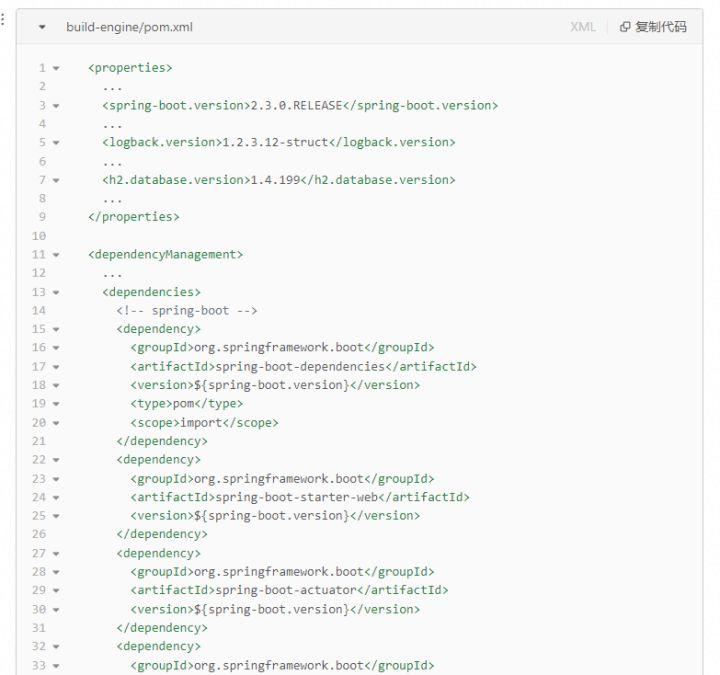 在子模块build-engine-api的pom.xml中,由于在父pom中配置了 dependencyManagement中依赖的spring-boot相关依赖的版本,因此在子模块的pom中,只需要在dependencies中直接声明依赖,确保了依赖版本的一致性。