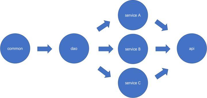 以上是并行构建的两个命令,可以根据实际的cpu情况来选择对应的命令。但是如果你发现构建时间并没有得到减少,那么你的maven模块间可能存在类似的依赖,模块之间只是一个简单的传递。