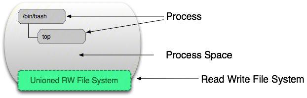 一个运行态容器(running container)被定义为一个可读写的统一文件系统加上隔离的进程空间和包含其中的进程。下面这张图片展示了一个运行中的容器。