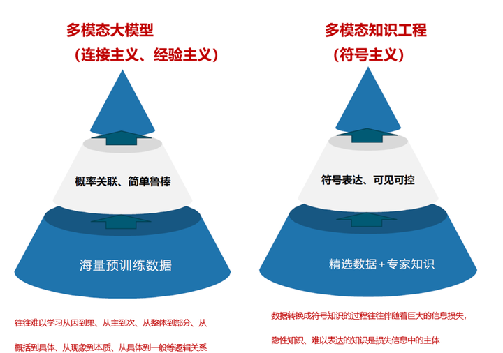 多模态大模型是一种连接主义和经验主义相结合的实现路径。它的核心思想是利用海量预训练数据来构建一个大规模的神经网络模型,能够自动学习和提取多模态数据中的特征和关系,并实现对多种语言、图像、音频等多种形式的信息进行联合理解。该方法具有概率关联、简单鲁棒等优点,但在学习逻辑关系等方面仍有局限性。 多模态知识工程则是一种符号主义的实现路径,主要依赖专家系统和知识图谱等手段,通过对精选数据和专家知识的整合和转化,将其转换成符号知识,实现对多模态数据的解析和分析。该方法具有易推理、可控、可干预、可解释等特点,但在信息损失方面存在一定的问题。 综合来看,多模态大模型和多模态知识工程各有优缺点,需要根据应用场景和需求进行选择和设计。在未来的研究中,我们需要进一步探索如何更好地结合两种实现路径,充分利用它们各自的优势,实现多模态认知智能的高效、准确和可解释性。 数据转换成符号知识的过程往往伴随着巨大的信息损失,隐性知识、难以表达的知识是损失信息中的主体, 在AIGC大模型时代,多模态知识工程依然不可或缺。