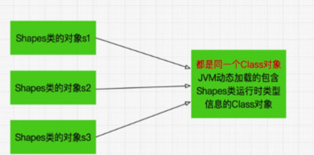 当我们new一个新对象或者引用静态成员变量时,Java虚拟机(JVM)中的类加载器子系统会将对应Class对象加载到JVM中,然后JVM再根据这个类型信息相关的Class对象创建我们需要实例对象或者提供静态变量的引用值。注意,我们定义的一个类,无论创建多少个实例对象,在JVM中都只有一个Class对象与其对应,即:在内存中每个类有且只有一个相对应的Class对象,如图: