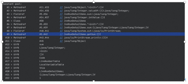 我们先通过JAVAP命令,展示上述代码对应的字节码,下图是JVM把类加载到内存以后在方法区的常量池中初始化好的Class对象和各种方法引用,这里面需要重点关注一下前面的#1,#2,#5这些符号,这些数字保存的是和Class对象以及方法的引用关系,后面的字节码中会用到。