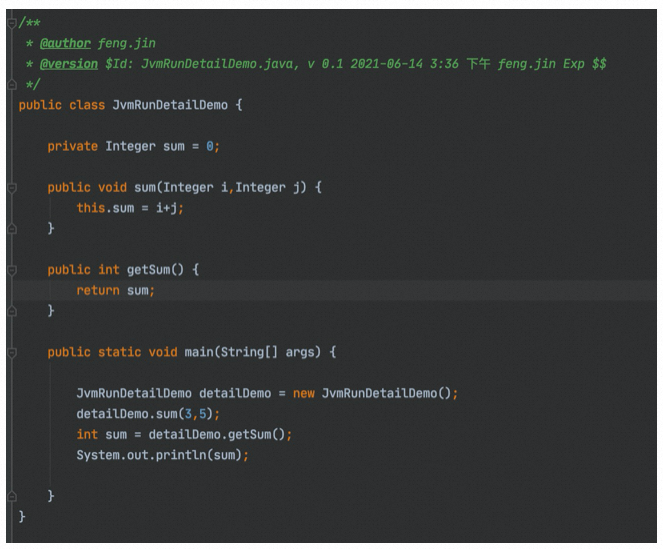 下面以一段实际的代码举例,来看一下,程序在JVM内部的执行过程。
